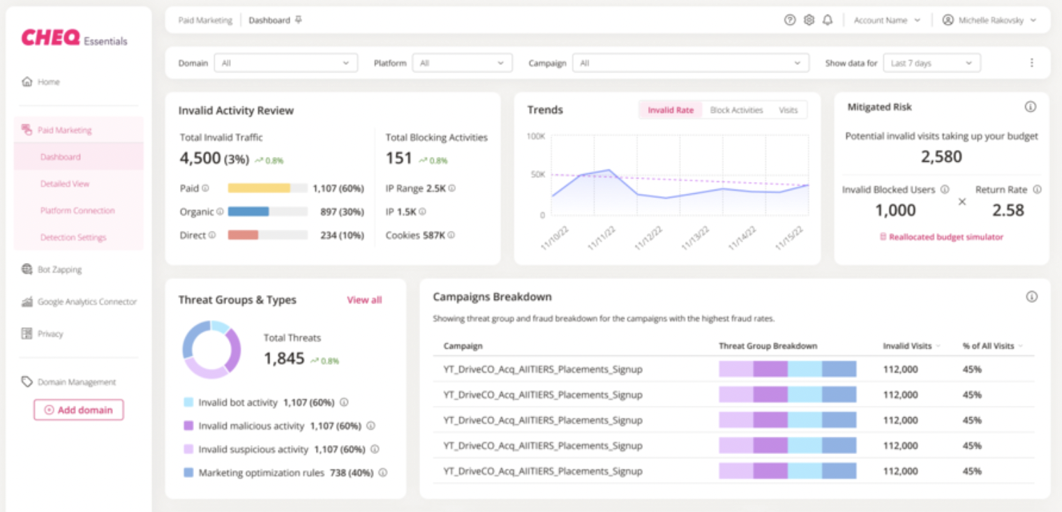 Click fraud eats up a surprising chunk of ad budget. Using specialized PPC tools like CHEQ Essentials or ClickGuard, you can block fake traffic and keep your budget focused on real users who might actually convert.