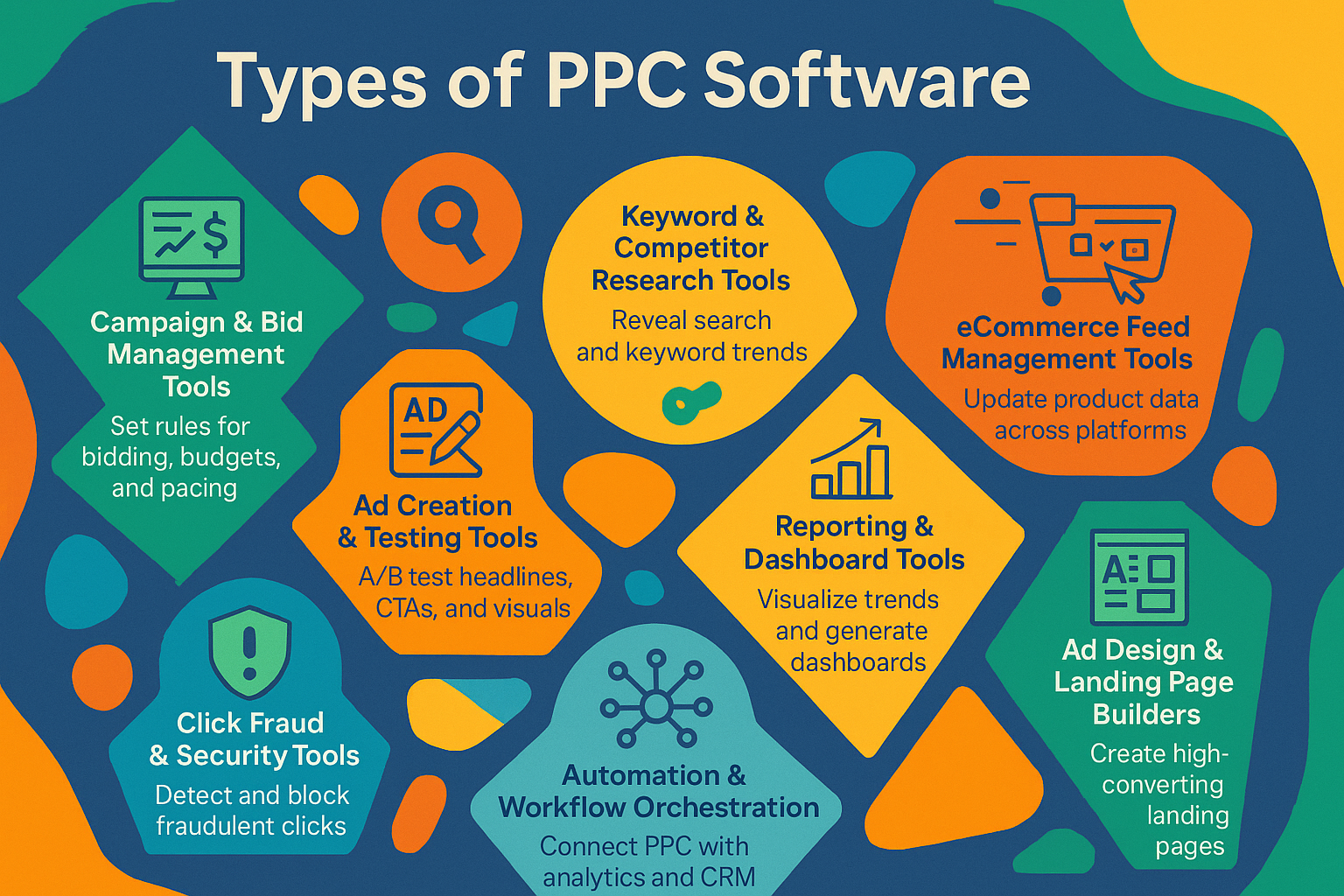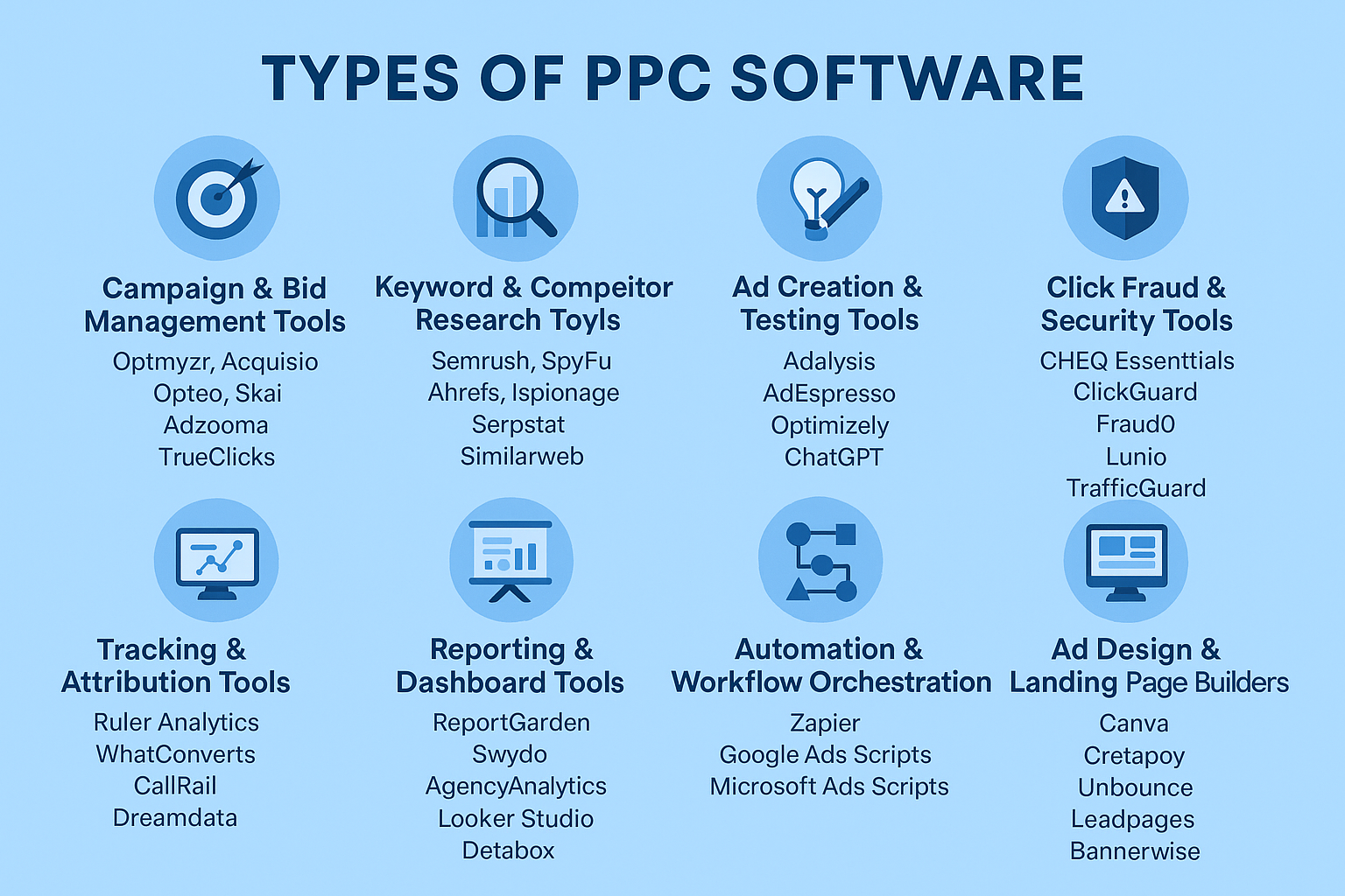 - A breakdown of the major types of software (from campaign & bid management tools to reporting & dashboard tools, click fraud & security tools, and more)
