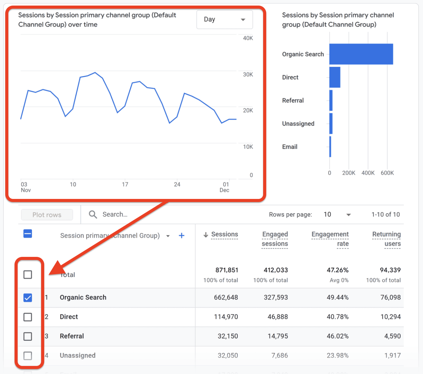 - To zero in on just organic search, uncheck everything except “Organic Search.”